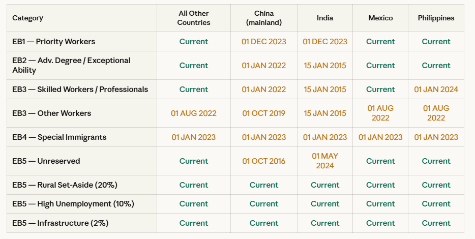 EB3 (India): November 15, 2013 — over 12 years of wait. India-born EB3 clients with priority dates in 2018 or later are looking at a potentially decades-long queue under the current per-country cap structure. This is a category where proactive case strategy matters enormously.