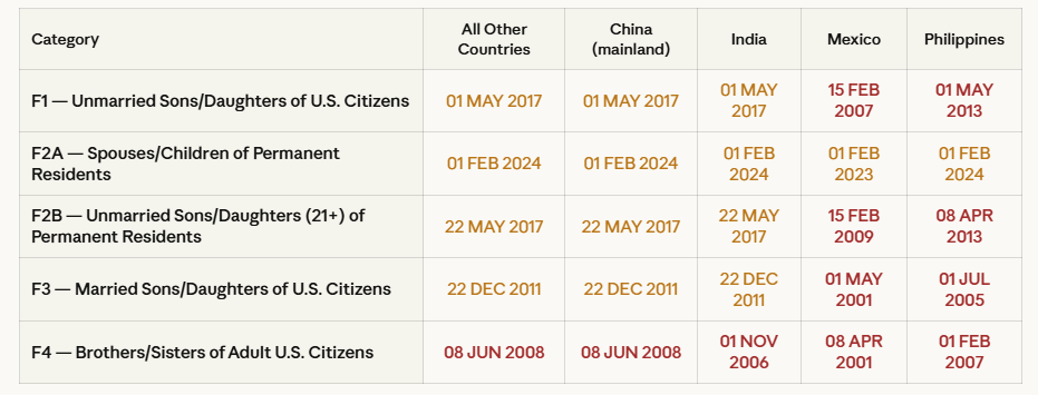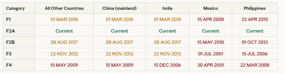 Mexico and Philippines across all categories: The backlogs for Mexico and the Philippines in family-sponsored categories are severe across the board. F3 for Mexico sits at May 1, 2001 — a 25-year wait. F4 for Mexico is April 8, 2001. These families need realistic timeline counseling paired with any available parallel strategies such as naturalization acceleration where eligible.
